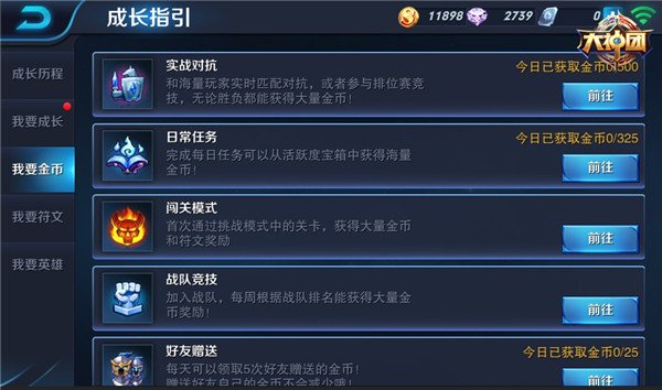 要想获得海量金币,首先要完成游戏中各式日常任务。玩家在对战中可以通过战斗来获取金币,也可以通过达成指定任务条件,完成任务来获得金币。在成长引导界面,我要成长任务可以获取经验和活跃度,活跃度达到一定数值,也可以领取金币。通过游戏内对战、任务等的积累,每天可以获取上千金币。